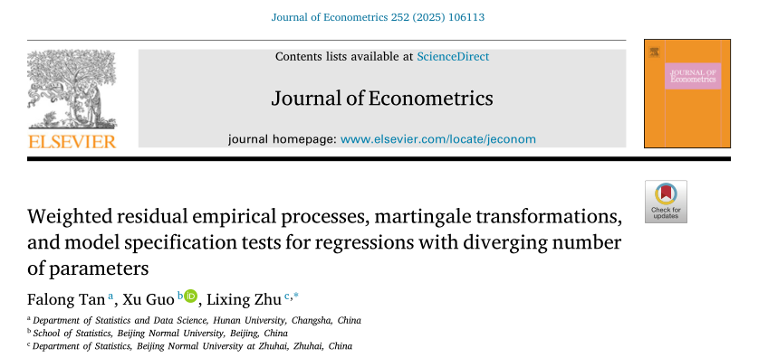 近日,永利皇宫赌场 谭发龙教授在高维统计领域取得研究进展,研究成果以“Weighted residual empirical processes, martingale transformations, and model specification tests for regressions with diverging number of parameters”为题在计量经济学国际期刊Journal of Econometrics在线发表。