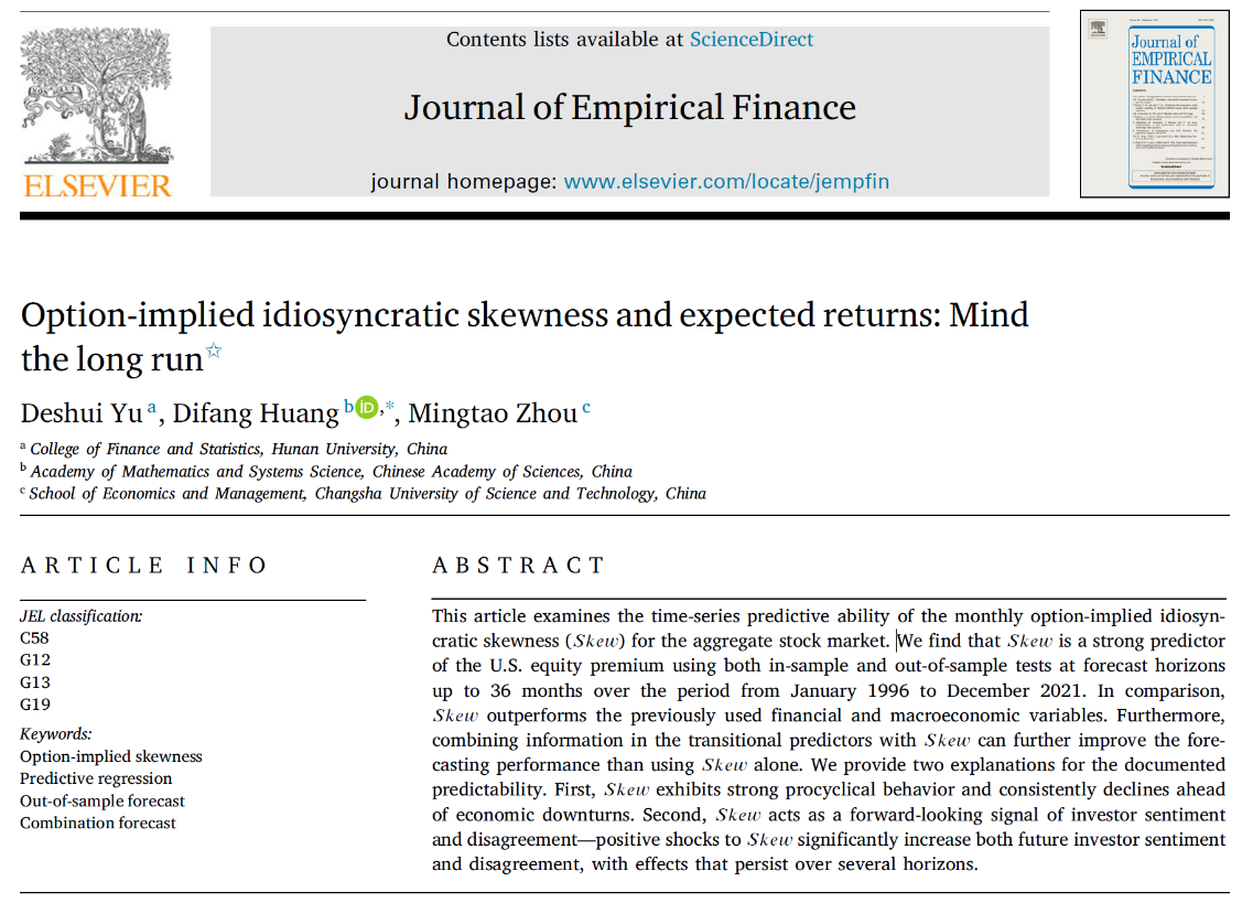 近日,永利皇宫赌场 金融科技与工程系余得水副教授的论文“Option-implied idiosyncratic skewness and expected returns: Mind the long run”在院定A2类期刊Journal of Empirical Finance,volume 83,September2025发表。