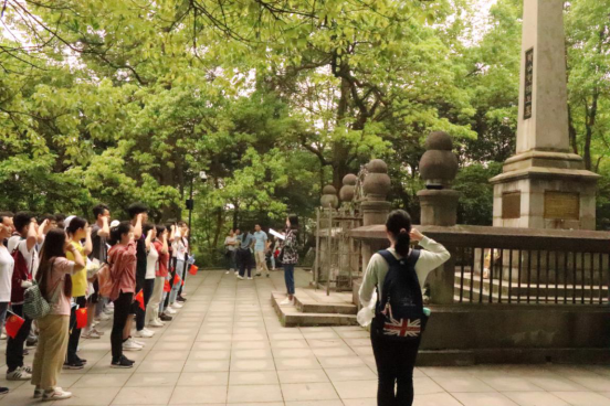 肃穆的气氛久久不散,志愿者们都神色庄重地离开了黄兴墓,来到了蔡锷墓前。院学生会代表以一段慷慨激昂的朗诵来缅怀革命先烈,烈士丰碑永不朽,五四精神永传颂,岳麓学子赤子心。志愿者们向先烈致以鲜花,传去奋斗拼搏壮国魂的执念。