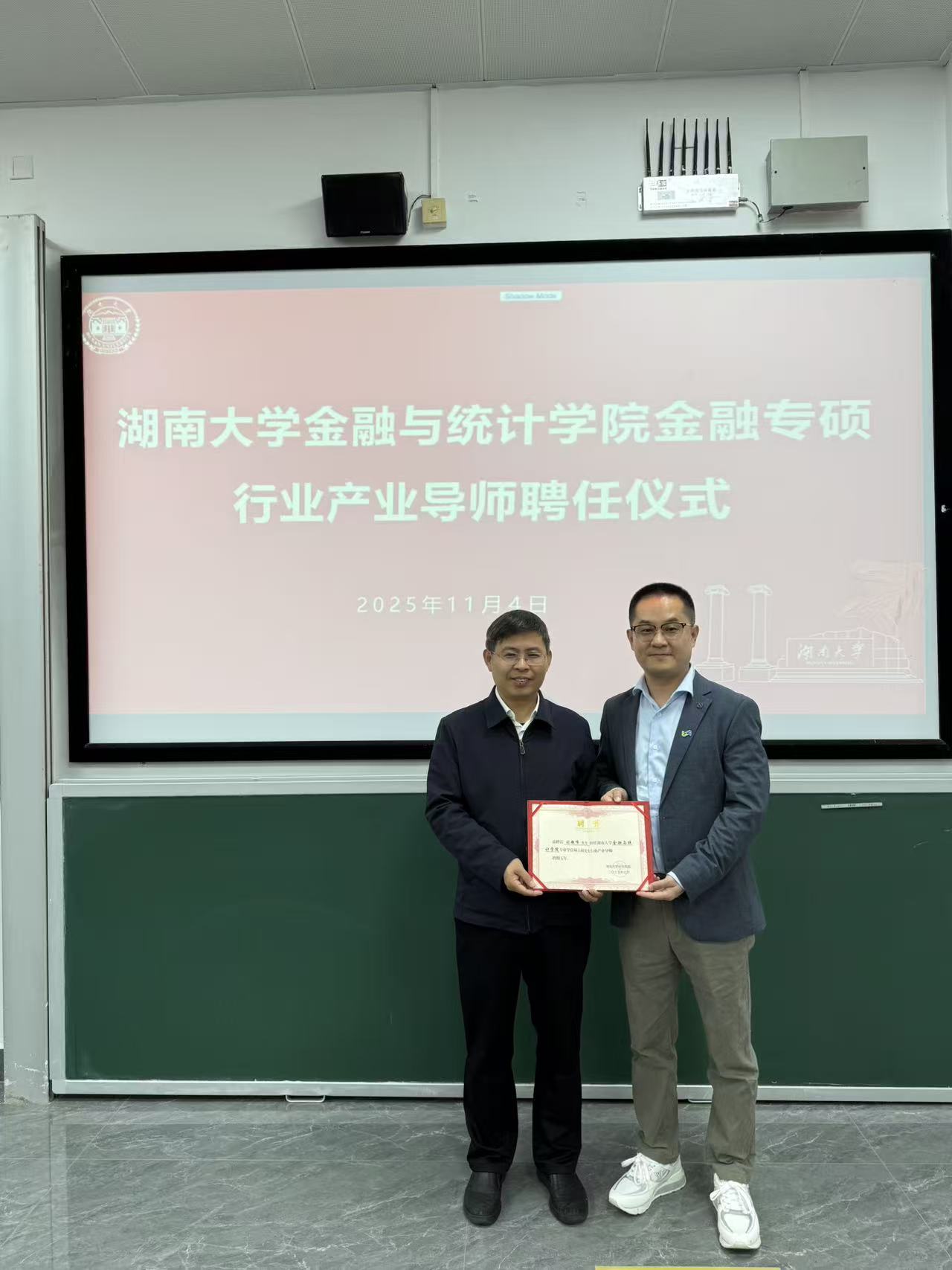讲座开始前,王修华院长为刘超峰先生颁发了永利皇宫赌场-永利在线赌场网站 专业学位硕士研究生行业产业聘书,赠送校徽,并合影留念。王院长对刘超峰先生来校授课表示衷心感谢,他指出,“业界导师进课堂”是永利皇宫赌场 深化产教融合、推动研究生教学改革的重要举措。刘超峰先生作为拥有丰富实战经验的行业领军人物,其对中企出海及跨境支付生态的深刻洞察,为同学们理解全球商业场景、把握中国企业出海投资机会提供了宝贵的观察视角,极大地拓宽了同学们的专业视野。
