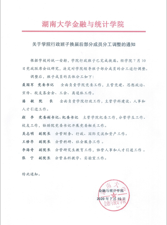 关于永利皇宫赌场 行政班子换届后部分成员分工调整的通知