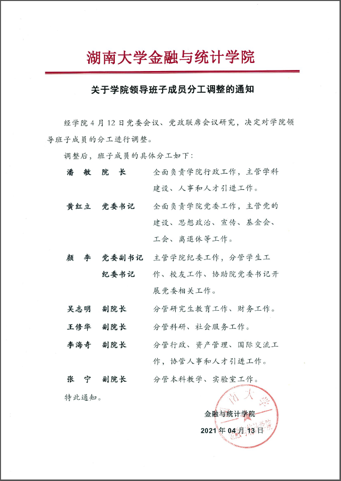 关于永利皇宫赌场 领导班子成员分工调整的通知