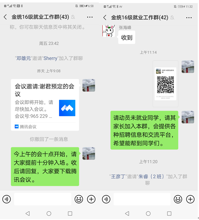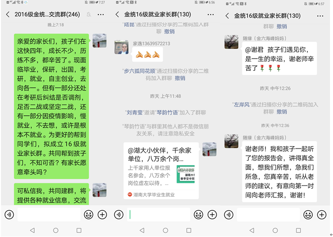 第二,发挥家长的作用,用亲情调动大家。年级建立“金统16级就业家长群”,搭建学校与家庭沟通的桥梁,实现家校联合,为家长了解学校助力毕业生就业的相关政策和平台提供渠道;调动家长的资源,为学生了解就业信息和增加升学机会提供动力。目前年级已有128位家长主动入群,家长与永利皇宫赌场 建立了密切的联系,信息畅通,在家长的鼓励与帮助下,很多同学重拾信心,找到方向,投递简历,效果显著。后续,永利皇宫赌场 将继续调动家庭这个大后方,动员家长的力量,为同学们的就业提供保障。